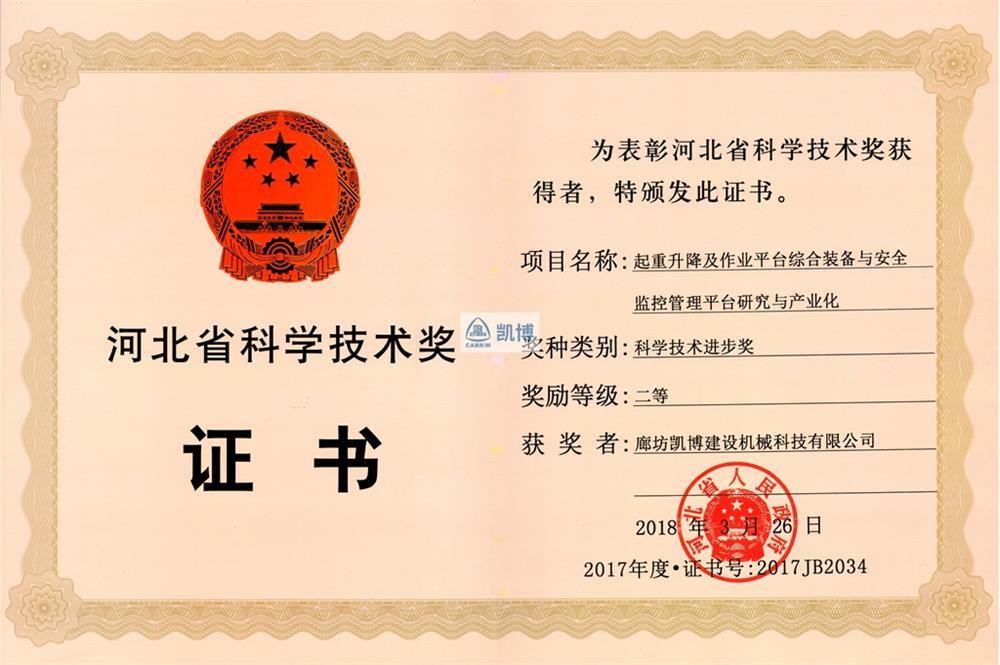 河北省科學(xué)技術(shù)獎(jiǎng)二等獎(jiǎng) 起重升降及作業(yè)平臺(tái)綜合裝備與安全監(jiān)控管理平臺(tái)研究與產(chǎn)業(yè)化