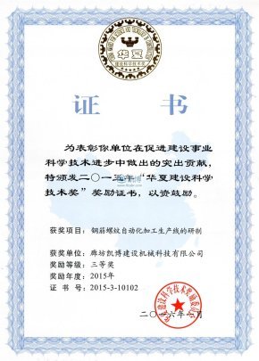 機(jī)械工業(yè)科學(xué)技術(shù)獎(jiǎng)三等獎(jiǎng)智能化鋼筋 部品生產(chǎn)成套設(shè)備研究與產(chǎn)業(yè)化開發(fā)