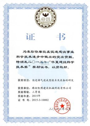 華夏建設(shè)科學(xué)技術(shù)獎(jiǎng) 住宅排氣道成型技術(shù)及設(shè)備的研發(fā)